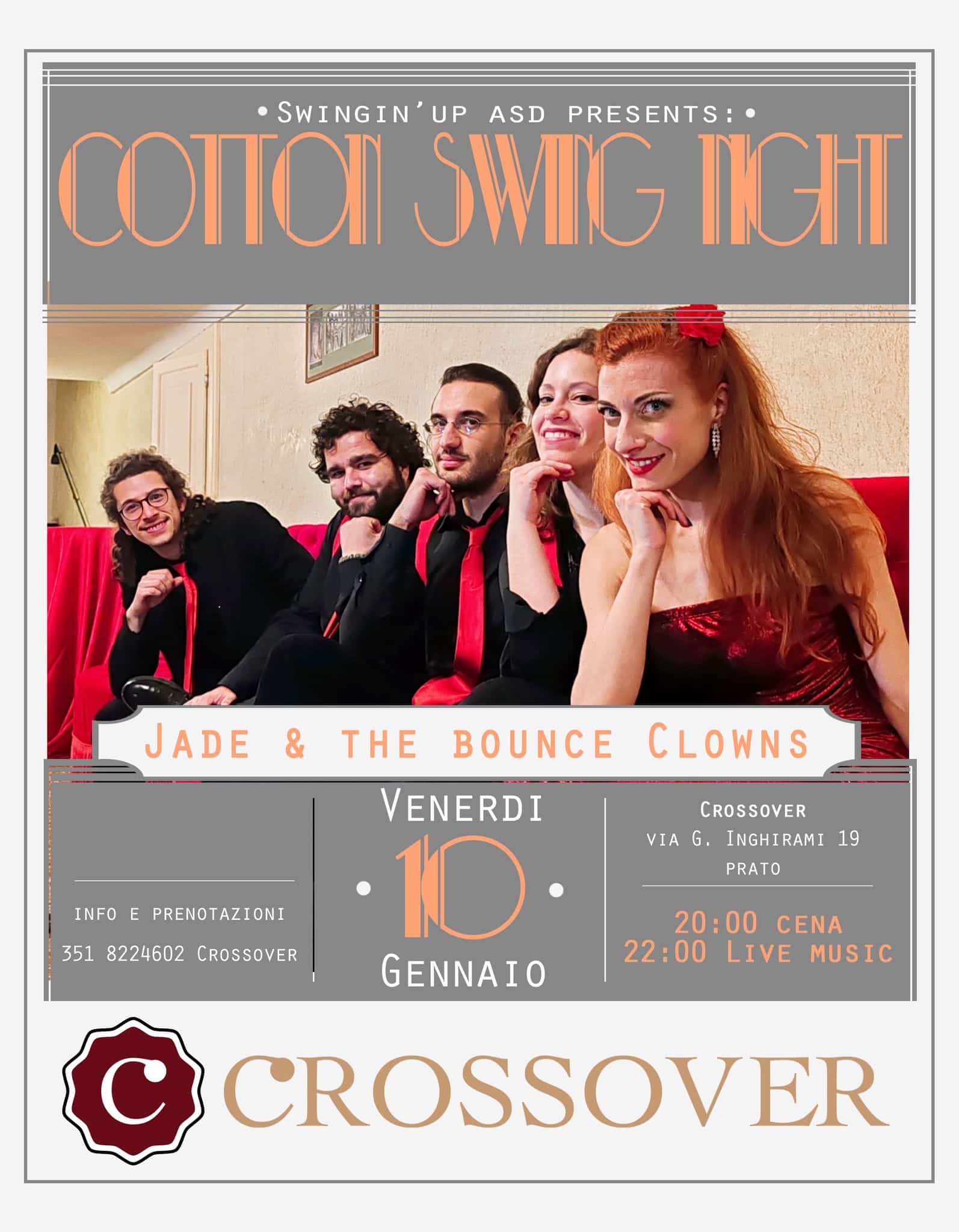 Ospite di questo appuntamento i JADE & THE BOUNCE CLOWNS , band che ci farà ballare grazie all’ampio repertorio che spazia dallo swing al rhythm&blues, con un tocco di rock’n’roll
