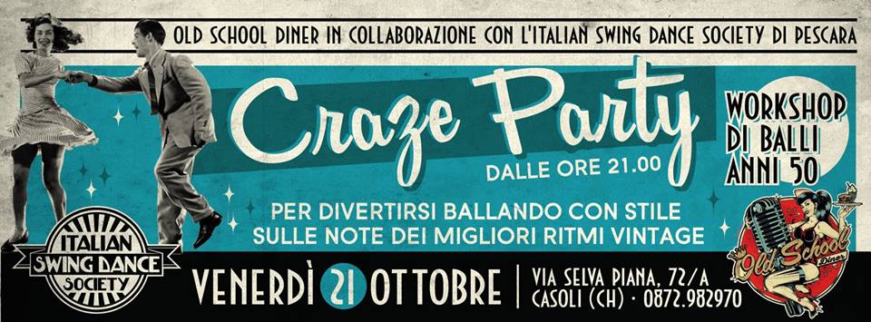 Ciao amici, vi avevamo promesso tante sorprese….vi sveliamo la prima!!! Per soddisfare le vostre numerose richieste, abbiamo organizzato, in collaborazione con l’Italian Swing Dance Society di Pescara, dei corsi di ballo sulle note dei migliori ritmi vintage (Boogie-Woogie, Lindy Hop, Jive). Potrete scoprire questo meraviglioso mondo partecipando al workshop (gratuito!) ed assistere alla lezione introduttiva con i passi base. Tutti gli interessati potranno, così, iscriversi e seguire i corsi che si svolgeranno nel nostro locale! Non mancate, quindi, all’appuntamento! Vi aspettiamo all’Old School Diner venerdì 21 ottobre alle 21,00!