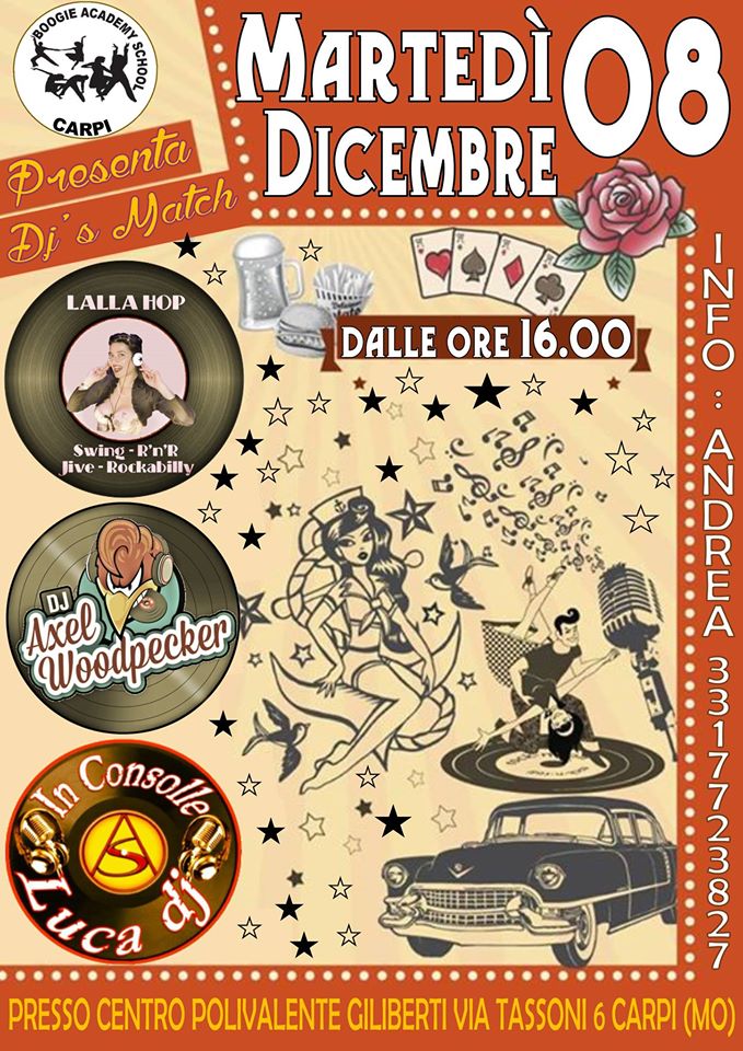 Pomeriggio e serata dedicata al boogie , rnr, lindy, balboa con una triade di dj provenienti da diverse province che si sfideranno in consolle a suon di swing x tutti i gusti. inizio fin dalle ore 16.