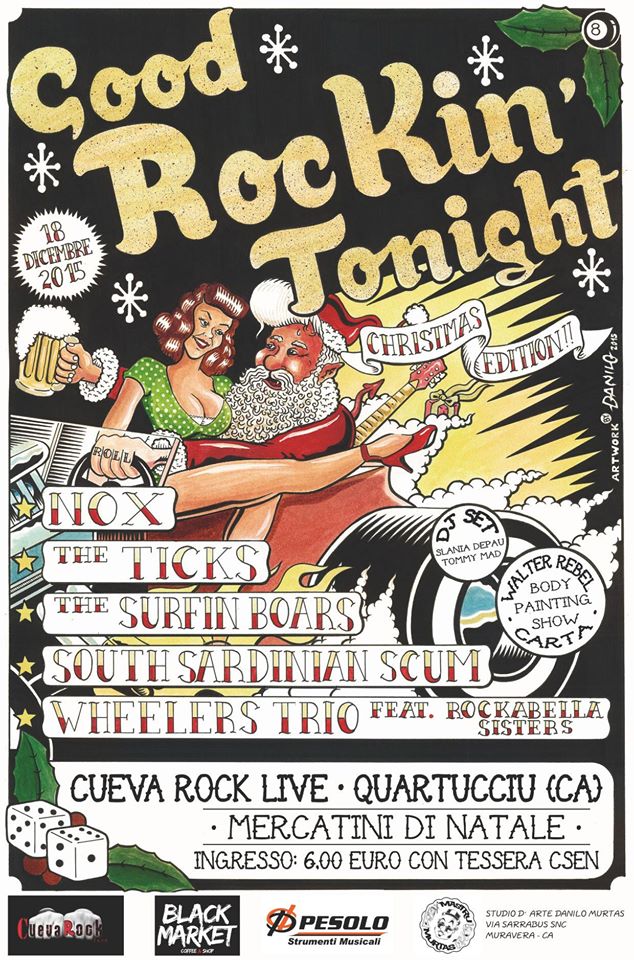 “Good Rockin’ Tonight – Christmas Edition 2015” é il I Festival rock’n’roll e rockabilly organizzato dal gruppo Facebook “Rock’n’Roll & Rockabilly Sardegna” e racchiude tutti i migliori gruppi della scena sarda. Ospite speciale della serata Walter Rebel Carta col suo “Body Painting Show”. A farvi ballare ci penseranno i DJ: Slania De Pau e Tommy Mad. Dalle 19:00 i fantastici mercatini di Natale, stand e bancarelle per i vostri acquisti di Natale. Tutto in una sera! Non mancate!