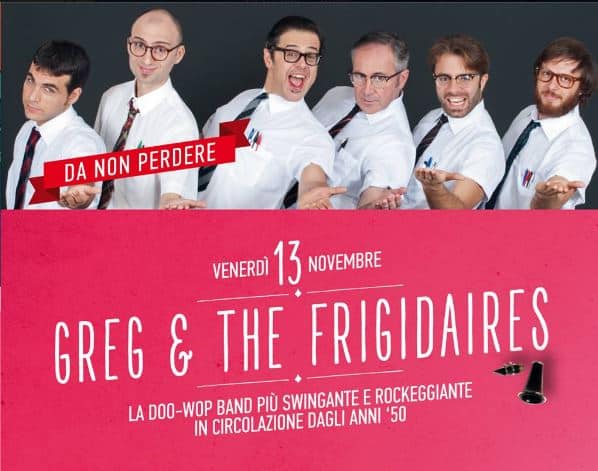 Greg, al secolo Claudio Gregori, calca il palco di ‘na cosetta insieme ai suoi The Frigidaires. Fra i tanti ruoli che ricopre come attore, autore radiofonico di 610 (sei uno zero) e frontman insieme a Lillo della ormai storica band di Latte e i suoi derivati, Greg nel 2012 ha dato vita a questo nuovo gruppo dalle sonorità anni ’50. Una vera Doo-Wop band, un quartetto vocale ed una solida ritmica che a suon di “Sha-badubudì” e “Ramalamading dong” ripercorrono uno dei generi più interessanti del decennio ’50/’60 con armonie vocali, ritmi swinganti e rockeggianti. Dai Coasters, a Dion & the Belmonts, ai Diamonds e molte altre band che hanno contribuito alla fama di questo genere. Un serata dedicata agli appassionati del Rhythm and Blues, del Rock & Roll e della musica dal sapore vintage.