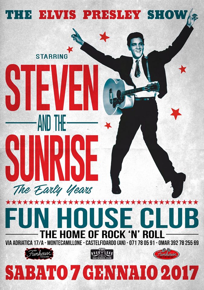 La serata si svolgerà con la proiezzione di filmati di elvis durante la cena, musica per ballare e in fine il concerto, per la prima volta al Funhouse Club la band “Steven and the Sunrise” the Early Years of Elvis! E’ gradita la prenotazione per la cena,come ogni compleanno che si rispetti -__spumantino e torta lo passiamo noi__!!!!!!!!!!