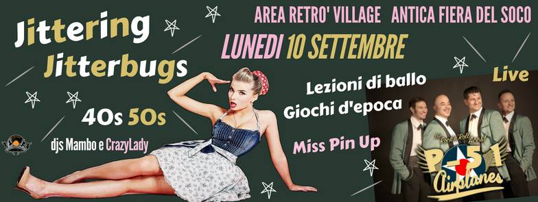 Passano i momenti più tristi della storia e ci si lancia nei mitici anni ’50 e si passa dal Doo-wop al rhythm’n blues fino ad arrivare allo scatenato rock’n’roll .. dalle 15.00 una super giornata, con giochi dell’epoca.. lezioni di ballo Crazy per tutti.. e si continua a ballare con Dj Mambo in consolle ..si ballera’ a piu’ non posso anche grazie alla super band P-51 che infiammera’ il palco per voi!!