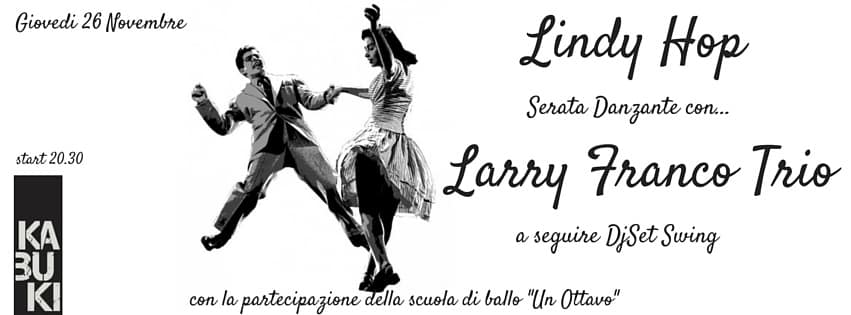 Per Kabuki in Jazz, la rassegna del giovedì dedicata al jazz, arriva al Kabuki la serata danzante Lindy Hop Hop con Larry Franco Trio in collaborazione con la scuola di ballo “Un Ottavo” e con la partecipazione del maestro di ballo Andrea Martinucci e Francesca Caggiano.