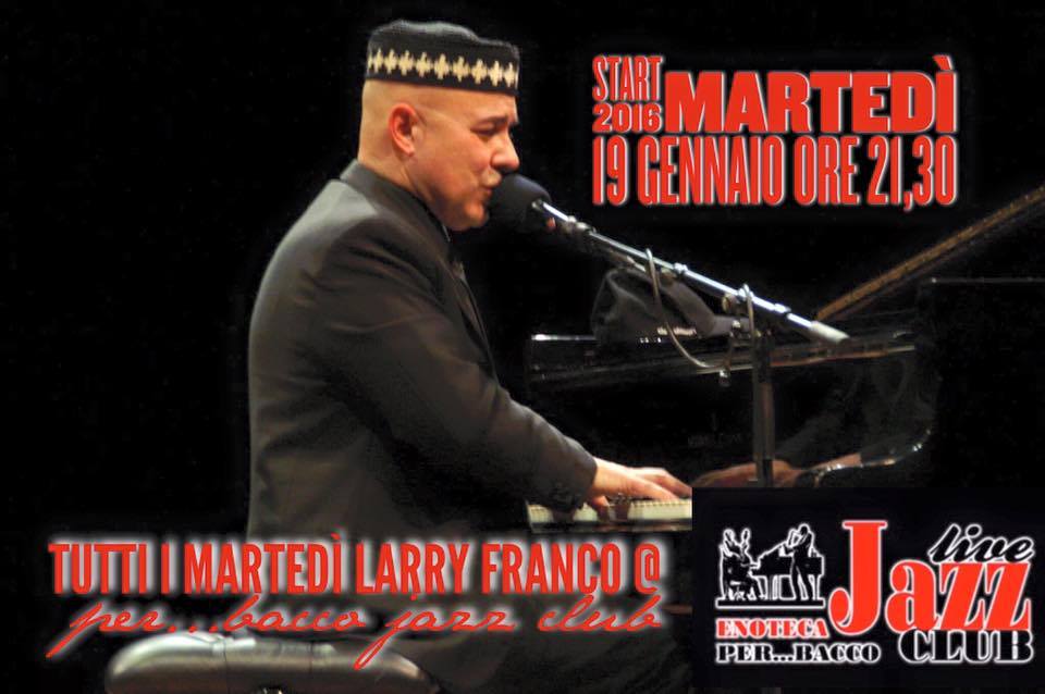 Metti le note romantiche che solo il Jazz può esprimere, la voce calda e suadente di un Crooner attore principale dei ricordi più belli, un bellissimo e lucidissimo pianoforte nero da concerto e tanta, tanta atmosfera che solo un Jazz Club come il Per..bacco può esprimere, il tutto per un appuntamento settimanale, questo del Martedì, ideato per tutte le coppie e per tutti coloro che vorranno trascorrere una serata in piena tranquillità ed armonia con se stessi o con il proprio partner coccolati dalle note calde del Jazz. E sarà il pianista e crooner Larry Franco al pianoforte e alla voce, che interpreterà per voi un repertorio interamente realizzato con brani che hanno segnato il meglio del Jazz cantato e suonato in un piano solo di grande effetto emotivo.