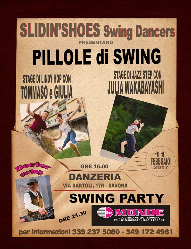 Gli Slidin’shoes hanno preparato per voi un appuntamento imperdibile. Nel pomeriggio avremo di nuovo con noi Tommaso e Giulia, fondatori della scuola “swing in florence”, con un appassionante stage di lindy hop.