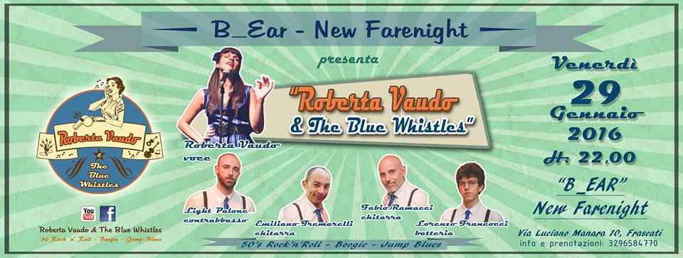 Volete tornare agli anni della brillantina, dei pois e delle Pin Up? La band “Roberta Vaudo & The Blue Whistles” sarà la macchina del tempo che vi catapulterà a ritmo di jump blues, boogie woogie e rock’n’roll nell’epoca dei juke box e delle Cadillac sfavillanti.