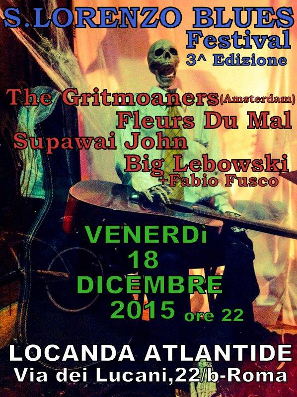 S.Lorenzo Blues Festival è il Festival dedicato al Blues delle migliori band che gravitano nel quartiere S.Lorenzo a Roma. riunite in un’unica serata dedicata al Blues e ai suoi sviluppi più recenti. Per la Terza Edizione del Festival gli ospiti d’onore sono The Gritmoaners duo di Blues & Roots provenienti da Amsterdam per la prima volta in Italia. Accanto a loro una selezione delle migliori bands Blues che gravitano a S.Lorenzo: i Fleurs du Mal band Rock/Blues storica, i Supawai John con il loro Blues venato di country e psichedelia e i The Big Lebowki con un set Folk/Rock-Blues e con l’aggiunta dell’ospite Fabio Fusco -valente chitarrista della band Blues Farm-.