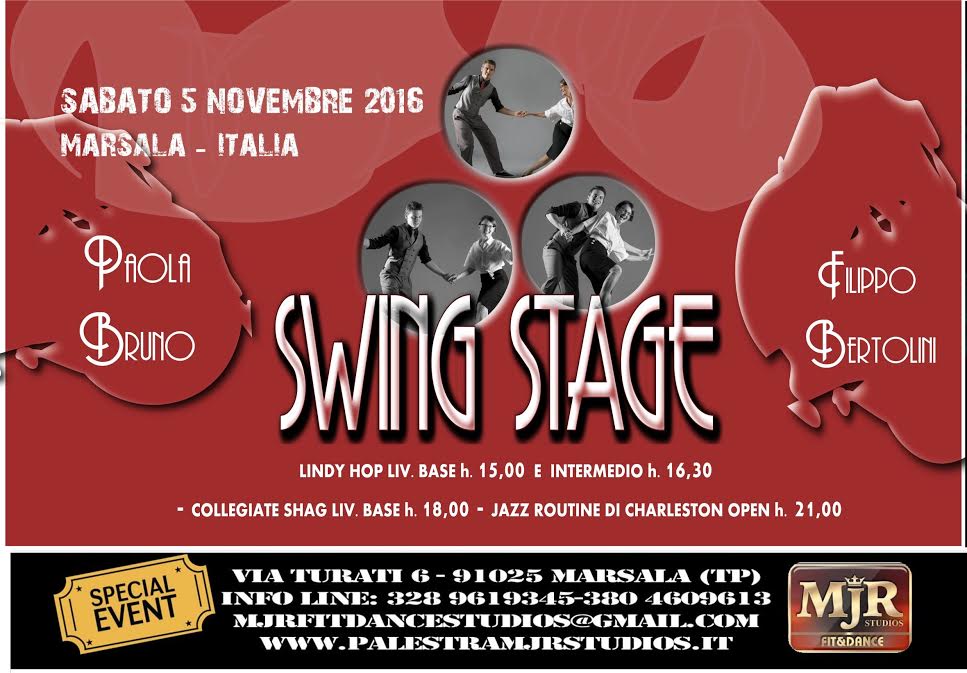 Tre ore di ballo di coppia e una individuale da concentrare nella giornata di sabato, più serata con semplice esibizione. (due livelli di lindy, base di Shag, più una Jazz Routine per tutti di Charleston adatta anche ai neofiti).