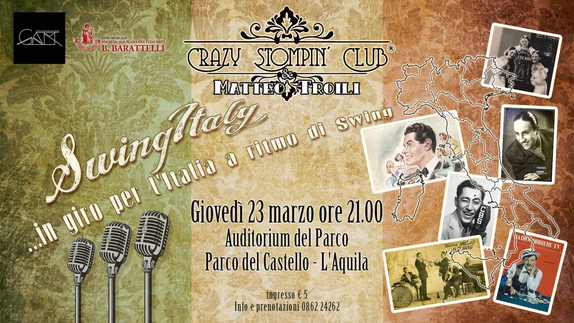 Il Crazy Stompin’ Club è lieto di accogliervi sulla sua macchina del tempo per percorrere un itinerario d’eccezione con um ospite d’eccezione, Matteo Troili, che insieme alle assistenti di volo, le Stompin Sisters, vi illustresanno le imprese degli italiani innamorati dello Swing vi farnno ricordare e conoscere artisti temerari che non si fecero spaventare del difficile periodo storico che attraversavano che, con furbizia e piccole strategie, hanno dato vita allo swing italiano.