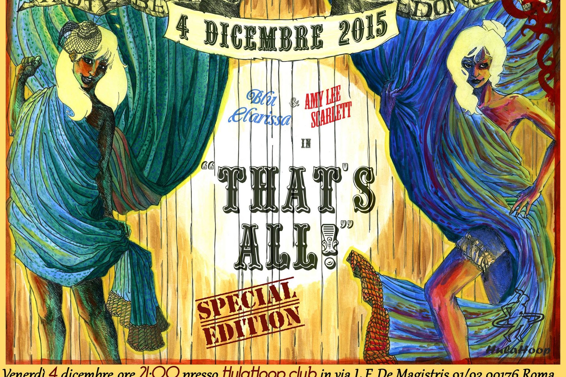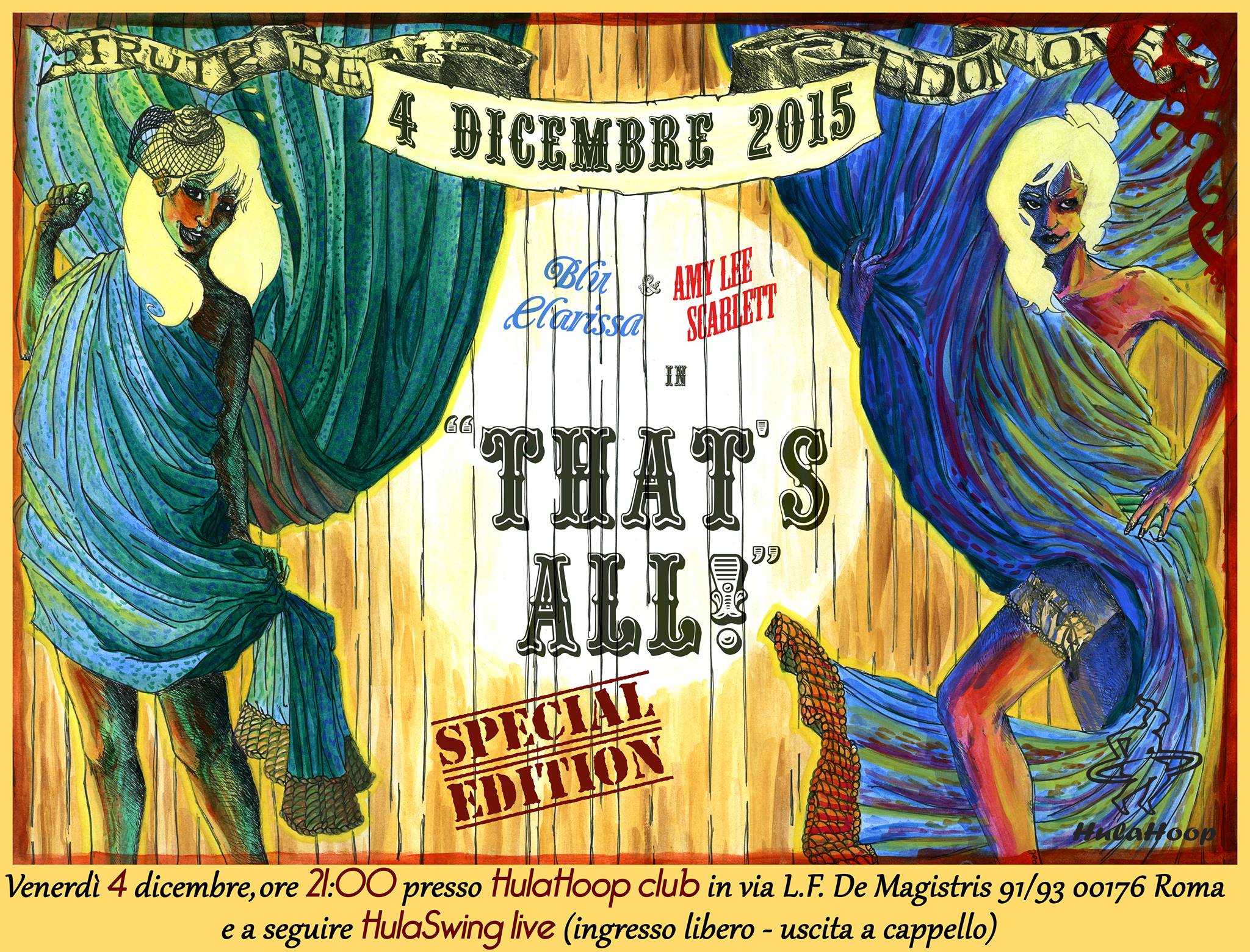 Lasciatevi sedurre da Amy Lee Scarlett e Blu Clarissa vi porteranno con frizzante leggerezza in un viaggio alla scoperta della donna e delle sue mille sfaccettature, vivendo con naturalezza la sensualità del corpo. Intrecceranno danza, clown, canto e burlesque come elementi di una giocoleria raffinata.
