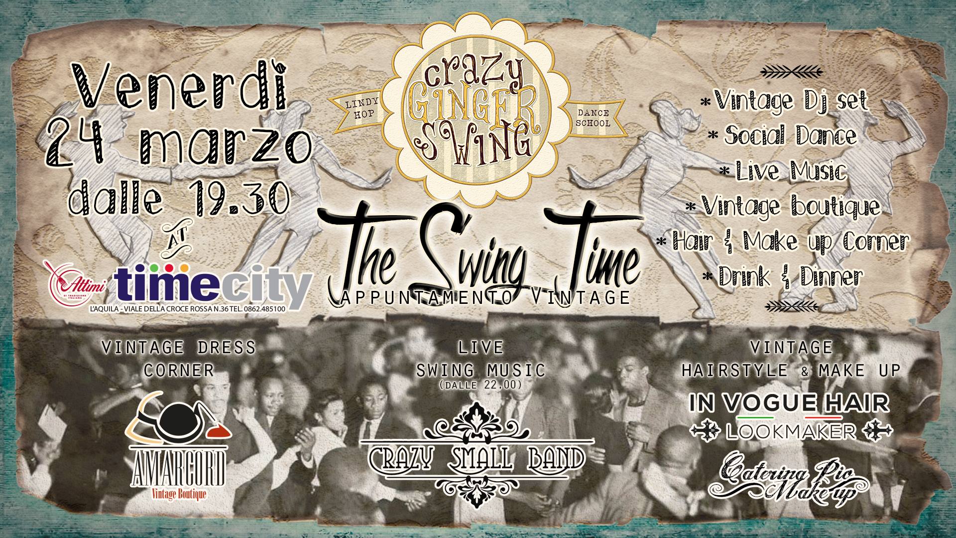 Vi aspettiamo al Time City per iniziare con un aperitivo accompagnato da una selezione swing tutta da ballare, ci sarà il corner Amarcord Boutique di Ivan Aquilio dove scegliere abiti d’epoca, farsi truccare e pettinare in perfetto stile vintage da Caterina Pio XI e InVogue Hair Look Maker, e non poteva mancare il Crazy Stompin’ Club con la sua small band che dalle 22:00 ci farà scatenare!