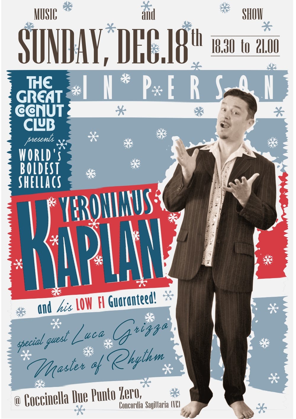 Music set di gommalacche a 78 giri, simpaticamente aggirati da una coppia di grammofoni portatili His Masters Voice mod. 101, miscellati per un ascolto ormai dimenticato e superato, pre-stereofonico ma non per questo preistorico. In questa breve avventura Yeronimus Kaplan si prodigherà in selezioni Swing, Ragtime, Blues, Hot Jazz dagli albori dei supporti fonografici alla pur semplice Bassa Fedeltà a tecnologia meccanica analogica.